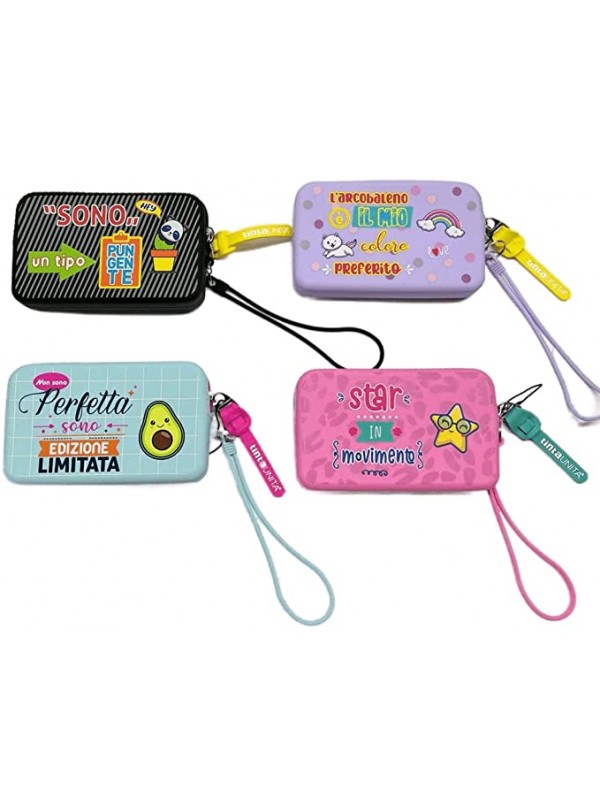 Busta rettangolare con laccetto da polso in silicone soft touch, sempre a portata di mano, tirazip in tessuto logato TintaUNITA in coordinato colore.