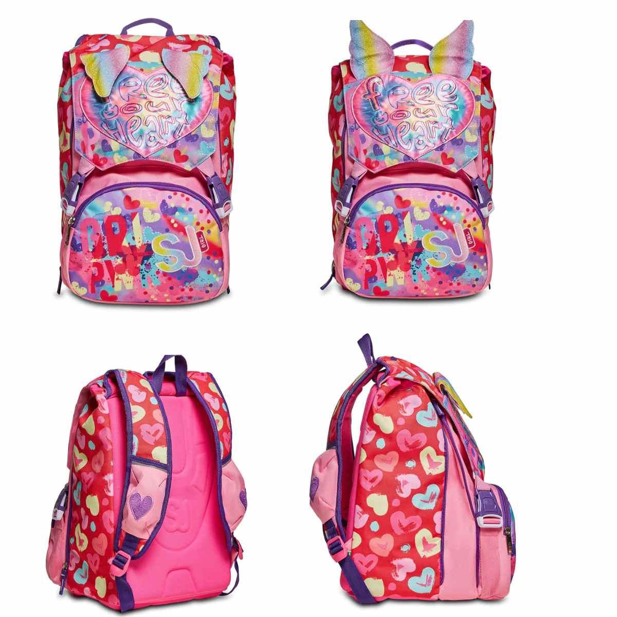 Zaino Seven estens. Big Sj Gang Wondrous Girl Zaino doppio scomparto estensibile tramite zip laterali. Ali in materiale “glitter sfumato” sollevabili tramite sistema ad aria attivabile dallo spallaccio con pulsante e applicazione in raso su pattina – Schienale: Ergosystem preformato con fondo integrato – Capacità : 21 LT – 28 LT – Dimensioni: 27 x 41 x 16 (+6) cm – Tasche: Tasca frontale. Tasca su pattina. – Spallacci: Imbottiti e rivestiti in tessuto e rete traspirante – Tessuto: Poliestere