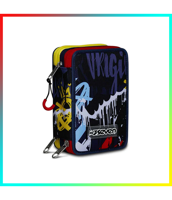 ASTUCCIO scuola 3 ZIP seven TRIPLO SCOMPARTO pencil case SPRAY WALL tre piani GRAFFITI completo Astuccio triplo scomparto 3 ZIP - SPRAY WALL - GRAFFITI completo di Seven. L’astuccio Seven 3 zip ha tre scomparti in cui troverai tutto il materiale necessario per la tua giornata di scuola. A te non resta altro che abbinarlo a uno zaino o a un trolley Seven. L'astuccio 3 zip Seven è l’accessorio che non può mancare nel tuo zaino… Perché dentro trovi tutto il necessario per la scuola: penne matite colorate pennarelli colla e tanto altro ancora! Triplo scomparto e massima qualità dei contenuti! Contenuto (46 pezzi): 18 Pastelli a colori mina 4.0 Seven Colour Code 18 Pennarelli lavabili Seven Colour Code 1 Penna cancellabile blu 1 Penna cancellabile rossa 1 Matitone fluo bicolor giallo e arancio Colour Code 1 Matita grafite Colour Code 1 Gomma Colour Code 1 Temperino barilotto a 2 fori 1 Colla stick Colour Code 1 Righello trasparente 1 Goniometro trasparente 1 Forbice in metallo con maniglia in plastica. Dimensioni: circa 125 x 20 x 7 cm.