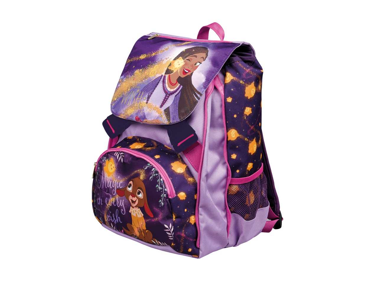 Zaino scuola sdoppiabile – Wish Dimensione: 28 x 40 x 13 (+9) cm. Capacità chiuso: 26 lt. Capacità aperto: 33 lt. Poliestere stampato Zaino doppio scomparto con tasca frontale e pattina stampate su tessuto effetto raso Ampia tasca su pattina Tasca laterale in rete porta borraccia Logo spessorato e serigrafato Schienale preformato Spallacci imbottiti e rivestiti in tessuto con sottosplaccio in rete Finitura scintillante